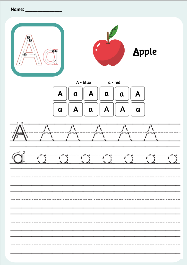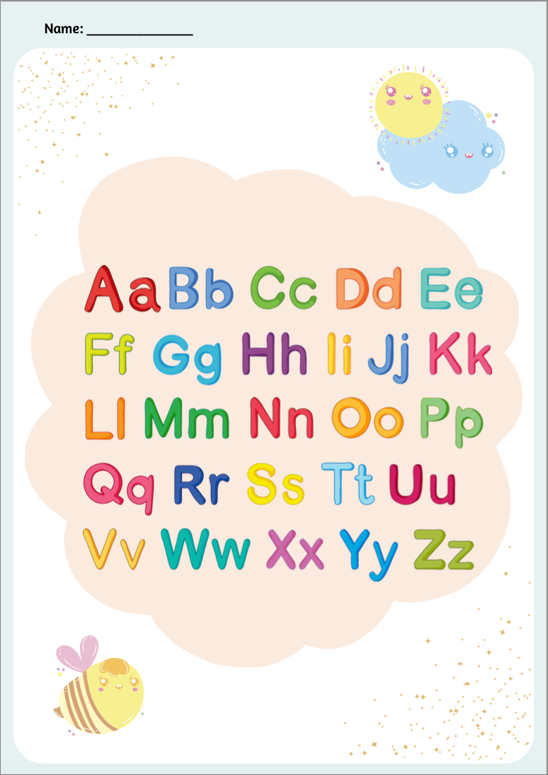 A pdf file containing 26 worksheets containing tracing practice for each letter of the English alphabet including writing practice for the whole alphabet at the end of the file.