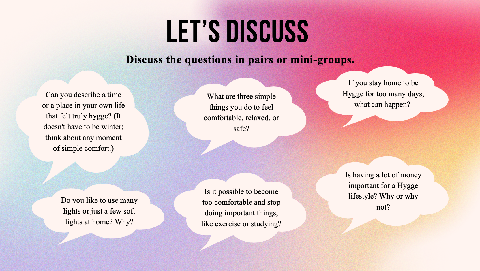 Here is some material for a lesson on Hygge for levels A2–A2+.