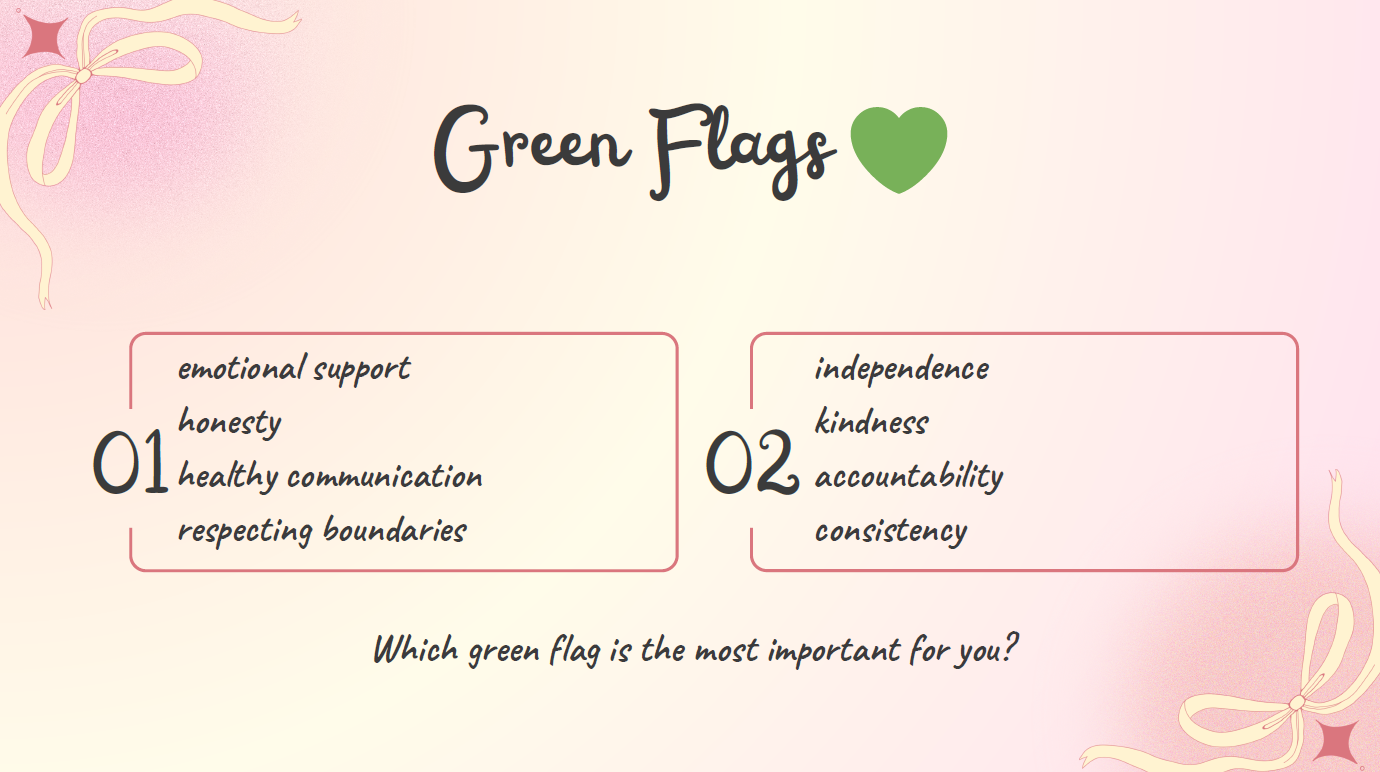 • Identify red and green flags in relationships